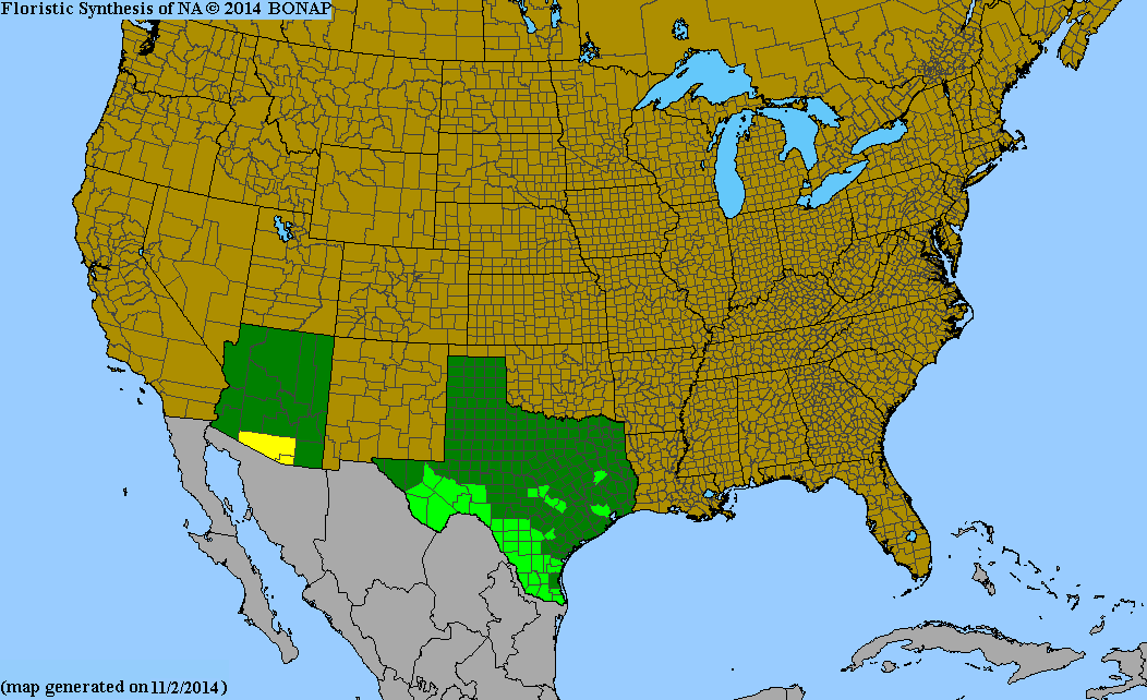 | Description | Habitat: Dry sandy, limestone or granitic soils, rocky slopes, outcrops, limestone bluffs, and dry washes. Plant: Densely-branched shrub 3 to 9 feet tall, older branches gray, younger reddish with fine grayish-white pubescent hairs. Leaves: Relatively broad (compared to g. var. gratissima) elliptic, obovate to oblong-elliptic blades 1/4 to 1 inch long and up to 1/4-inch wide on short petioles; leaf axils often with fascicles (bundles) of younger leaves; margins entire or with 1 to 4 prominent teeth on each side; upper surface with impressed veins, lower with stiif hairs; tips pointed or rounded. Inflorescence: Many small white blossoms, each 1/8 to 3/16-inch wide in leafy panicles of many slender, elongated spike-like racemes, 3/4 to 2-1/2 inches long growing from leaf axils; 4-lobed corollas are white, sometimes with a purplish tinge; corolla tubes are very hairy on the outside. Bloom Period: March to November. References: "Manual of the Vascular Plants of Texas" by Correll and Johnston, "Flowering Plants of the Trans-Pecos Texas and Adjacent Areas" by Powell, Worthington and Powell, "Wildflowers of the Texas Hill Country" by Marshall Enquist and SEINet. |