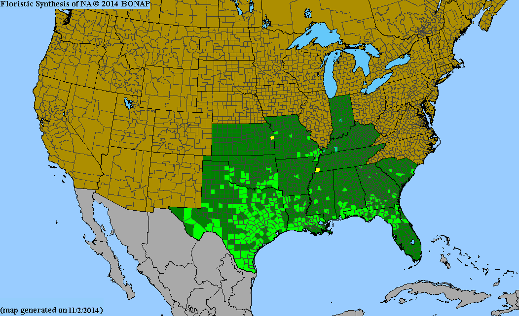 | Description | Habitat:  Usually sandy or limestone soils; dry prairies, overgrazed pastures, rocky hills, open woodlands, and roadsides. Plant: Annual 8 to 40 inches tall, branched; yellow-brown stem hairs on newer growth, becoming smooth. Leaves: Pale-green ovate-lanceolate blades 1/1/4 to 2-3/4 inches long; margins entire, sharply pointed tips; petioles longer (up to 2-3/4 inches) below, becoming much shorter (about 1/2-inch long) near branch tips. Inflorescence: Small blossoms in short racemes 0.6 to 1.2 inches long; staminate (male) flowers with 7 to 12 stamens, 5 hairy sepals and petals; pistillate (female) flowers with 7 to 8 sepals, 3 styles and no petals. Fruit: Mostly round capsules about 1/4-inch diameter, 3-seeded. Bloom Period: May to December. References: Flora of North America, Shinner and Mahler's Illustrated Flora of North Central Texas, and Kansas Wildflowers. | BONAP Distribution Map  Map Color Key | Texas Status: Native |