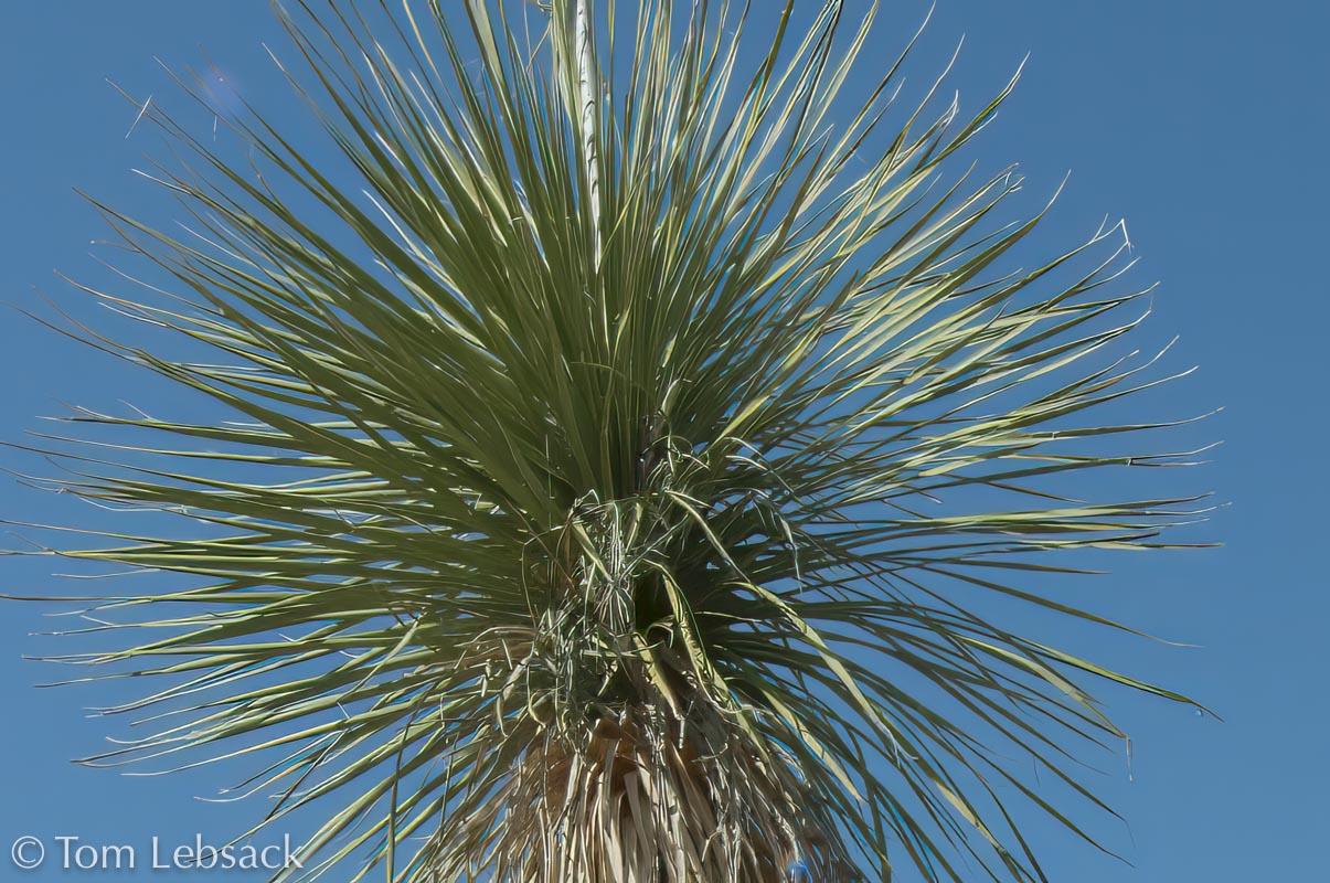 | Description | Habitat: Desert habitat; rocky slopes and knolls, 650 to 4600 ft. Plant: Solitary, erect, large, tree-like, usually single trunk up to 10 feet high, not including flower spike. Leaves: Often asymmetrical rosette of 100 or more leaves radiating from the top of the trunk with drooping dead leaves below; thin, flexible, mostly linear leaves up to 18 inches long and 1/2-inch wide; yellow or brownish edges are hard ("corneous" or of a texture resembling horn) and may be finely toothed, no fibers. Inflorescence: A very large cluster of blossoms in a narrowly ellipsoidal panicle from 1-1/2 to 3 feet tall starting usually 4 to 8 inches above the leaves and with 20 to 34 branchlets; many hanging, globe- to bell-shaped flowers, white petals 1-1/2 to 2-1/2 inches long. Bloom Period: April to May. Fruit: Erect ellipsoidal capsule, 1-3/8 to 2-3/4 inches long and 3/4 to 1 inch across with a long twisted beak that flares when dry. References: "Little Big Bend" by Roy Morey, "Manual of the Vascular Plants of Texas" by Correll and Johnston, and SEINet. |